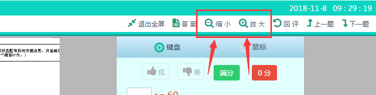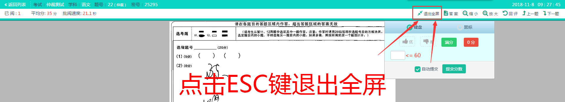 点击全屏即可使阅卷界面铺满电脑屏幕;按Ese键退出;